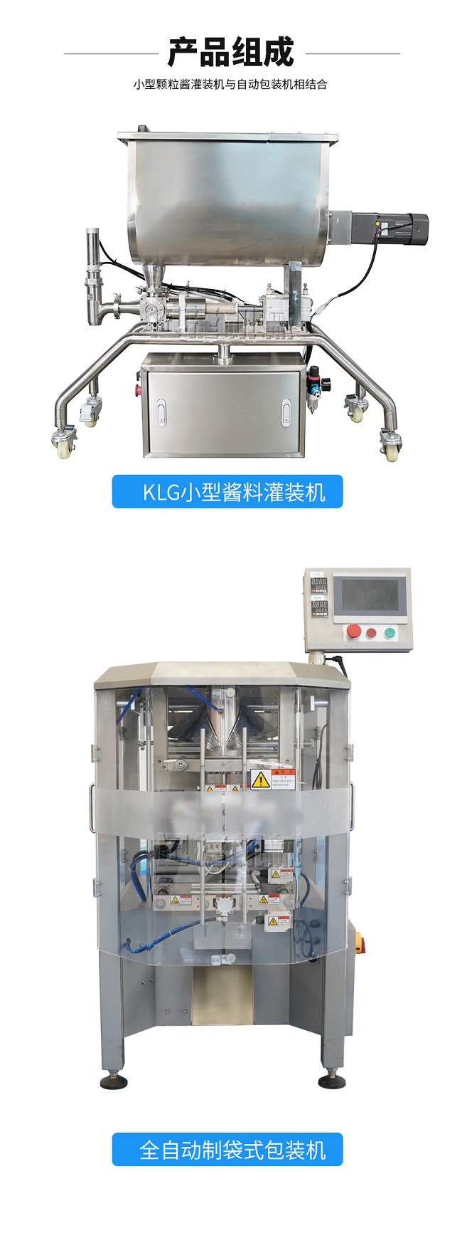 本機器主要用于調味品醬料的自動化包裝,機器安裝有橫向螺帶式攪拌,使油醬混合均勻,確保灌裝精度和產品包裝成品的均勻性。灌裝計量設備安裝有萬向輪,管路鏈接均采用快拆接頭,方便灌裝機拆卸移動清洗。包裝設備采用全伺服驅動器,包裝速度快,運行穩定。設備構成組件:攪拌式定量灌裝機一臺管道鏈接組件2米。