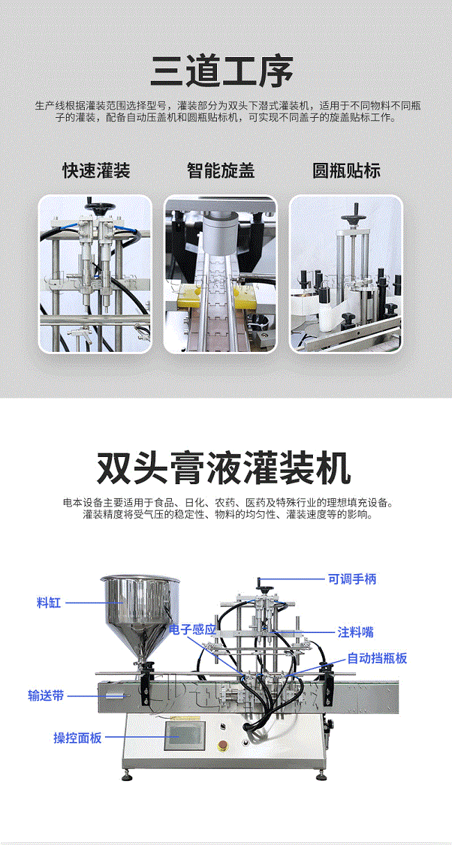 產品說明:生產線根據灌裝范圍選擇型號,灌裝部分為雙頭下潛式灌裝機,適用于不同物料不同瓶子的灌裝,配備自動壓蓋機和圓瓶貼標機,可實現不同蓋子的旋蓋貼標工作。 本設備主要適用于食品、日常化工、農藥、醫藥和特殊行業。灌裝精度將受氣壓的穩定性、物料的均勻性、灌裝速度等的影響。